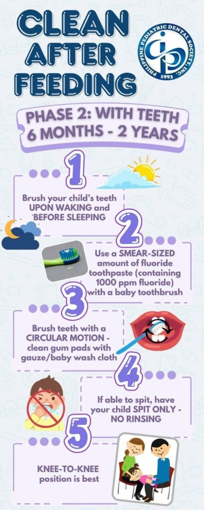 The American Academy of Pediatric Dentistry recommends cleaning an infant’s gums with a soft, damp cloth even before the first tooth erupts. Once teeth appear — often around six months — parents can use a small, soft-bristled toothbrush with a smear of fluoride toothpaste (about the size of a grain of rice for children under three).